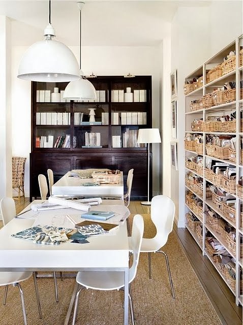 With my transition out of the typical office setting into my own home office, I have come to realize that I need to get my butt in gear. I spend a good chunk of time in my office so I need to pull it together, just like any other project I work on.  It needs to be a place that inspires my creativity and motivates me to want to be in there. I have been working on my pinterest board, Office Spaces, to get my juices flowing for this space. I want it to be a neutral space, to allow the colour palettes I am working on stand out. Also, my wall colour is Benjamin Moore Gray Mist (CC-80), and I don’t particularly want to change it. Here are some photos that have got me thinking….